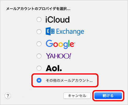 [その他のメールアカウント]を選択し、[続ける]をクリックします。