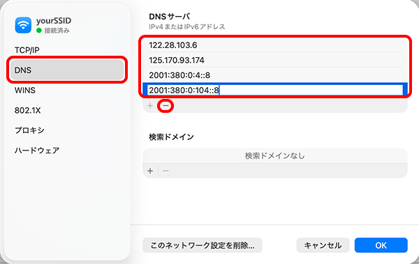 [DNS サーバ]の中のアドレスを選択し、下の[-]をクリックしてすべて削除します。